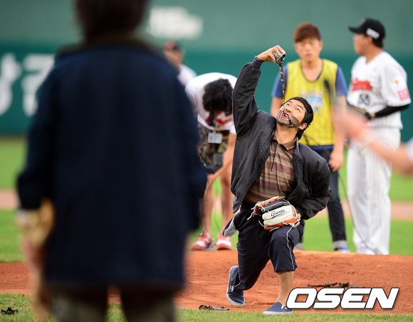31일 오후 부산 사직야구장에서 열린 롯데 자이언츠와 LG 트윈스의 경기, 경기에 앞서 개그콘서트 '황해' 홍인규, 이상구가 시구 시타를 하고 있다.
