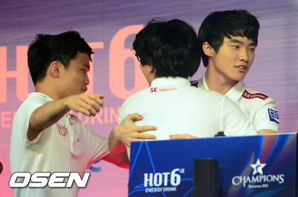 31일 오후 잠실 올림픽 보조경기장에서 열린 'LOL 챔피언스 리그(롤챔스)' 서머시즌 KT불리츠와 SK텔레콤 T1의 결승전 종료 후 SK 선수들이 승리를 기뻐하며 포옹을 하고 있다.