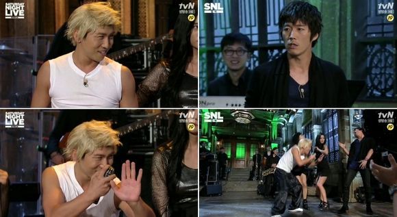 유세윤은 31일 방송된 tvN 'SNL코리아'에 금발 머리에 민소매를 입은 모습으로 등장해 눈길을 끌었다. 그는 여성 댄서들과 무대에 올라 장혁이 과거 발표했던 곡 '헤이걸(Hey Girl)'을 열창해 웃음을 자아냈다.