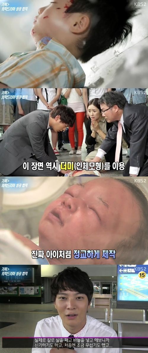 쓰러진 아이 대신, 더미로 수술 장면을 촬영한 시온 역 주원은 "실제로 칼로 살을 째고 바늘을 넣으니 신기하고, 처음에는 조금 무섭기도 했다"라며 "아무래도 더미가 비싸다"라는 소감을 전했다.