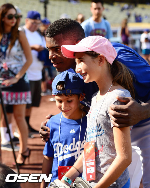 1일 (이하 한국시간) 미국 캘리포니아주 로스앤젤레스 다저스타디움에서 2013 메이저리그 LA 다저스와 샌디에이고 파드리스 경기가 열릴 예정인 가운데, 다저스 푸이그가 훈련시간에 팬들과 포토타임을 갖고 있다.