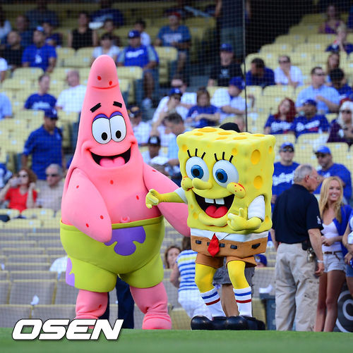 1일 (이하 한국시간) 미국 캘리포니아주 로스앤젤레스 다저스타디움에서 2013 메이저리그 LA 다저스와 샌디에이고 파드리스 경기가 열릴 예정인 가운데,다저스타디움에 스펀지밥 캐릭터 인형이 포즈를 취하고 있다.