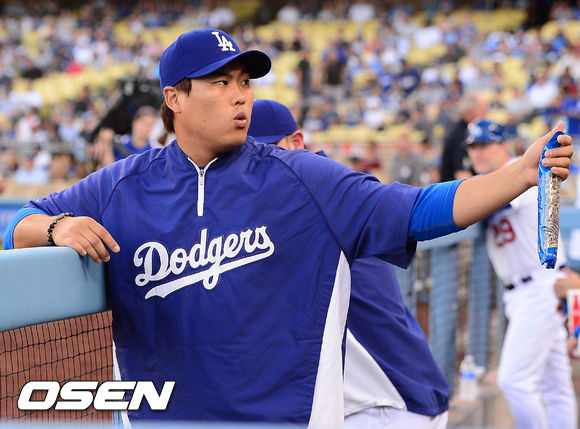 1일 (이하 한국시간) 미국 캘리포니아주 로스앤젤레스 다저스타디움에서 열린 2013 메이저리그 LA 다저스와 샌디에이고 파드리스 경기, 덕아웃에서 류현진이 사인 요청에 공을 던지라고 말하고 있다.