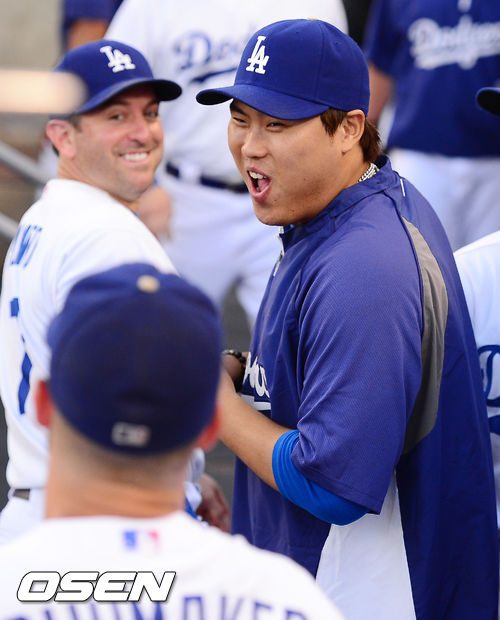 1일 (이하 한국시간) 미국 캘리포니아주 로스앤젤레스 다저스타디움에서 열린 2013 메이저리그 LA 다저스와 샌디에이고 파드리스 경기, 덕아웃에서 류현진이 덕아웃에서 동료들과 하이파이브를 하며 환하게 웃고 있다.