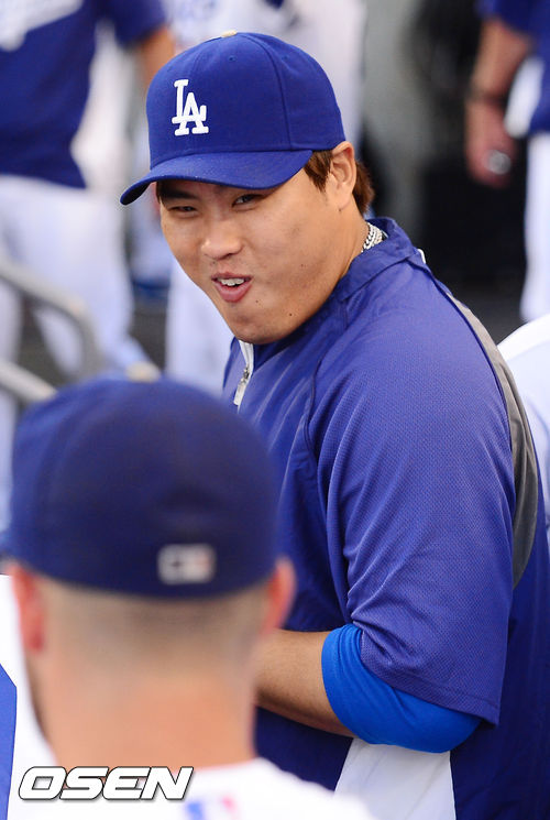 1일 (이하 한국시간) 미국 캘리포니아주 로스앤젤레스 다저스타디움에서 열린 2013 메이저리그 LA 다저스와 샌디에이고 파드리스 경기, 덕아웃에서 류현진이 슈마커와 즐겁게 얘기를 나누고 있다.