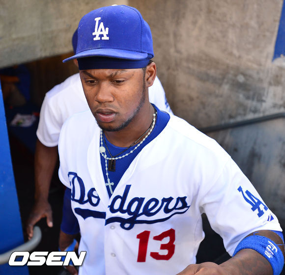 1일 (이하 한국시간) 미국 캘리포니아주 로스앤젤레스 다저스타디움에서 열린 2013 메이저리그 LA 다저스와 샌디에이고 파드리스 경기, 덕아웃에서 라미네스가 촬영을 하고 있는 취재진 배에 하이파이브를 하고 있다.