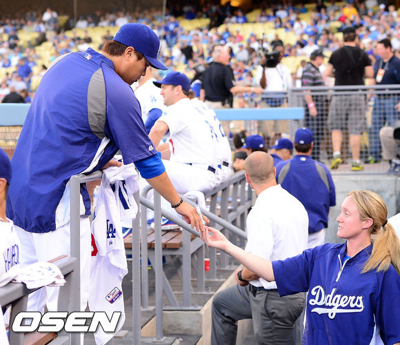 1일 (이하 한국시간) 미국 캘리포니아주 로스앤젤레스 다저스타디움에서 열린 2013 메이저리그 LA 다저스와 샌디에이고 파드리스 경기, 덕아웃에서 류현진이 팬에게 사인을 해주기 위해 네임팬과 유니폼을 전달받고 있다.