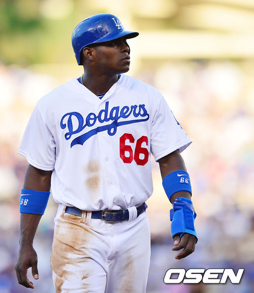 1일 (이하 한국시간) 미국 캘리포니아주 로스앤젤레스 다저스타디움에서 열린 2013 메이저리그 LA 다저스와 샌디에이고 파드리스 경기, 1회말 1사 주자 1루 다저스 곤살레스 타석에서 1루 주자 푸이그가 1루 도루에 실패한 후 아쉬운 표정을 짓고 있다.