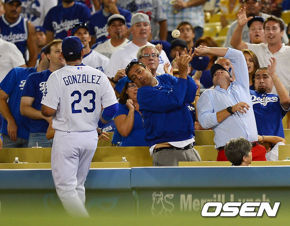 1일 (이하 한국시간) 미국 캘리포니아주 로스앤젤레스 다저스타디움에서 열린 2013 메이저리그 LA 다저스와 샌디에이고 파드리스 경기, 6회초 1사 주자 없는 상황에서 샌디에이고 블랭크스의 파울타구를 팬들이 잡으려하고 있다.