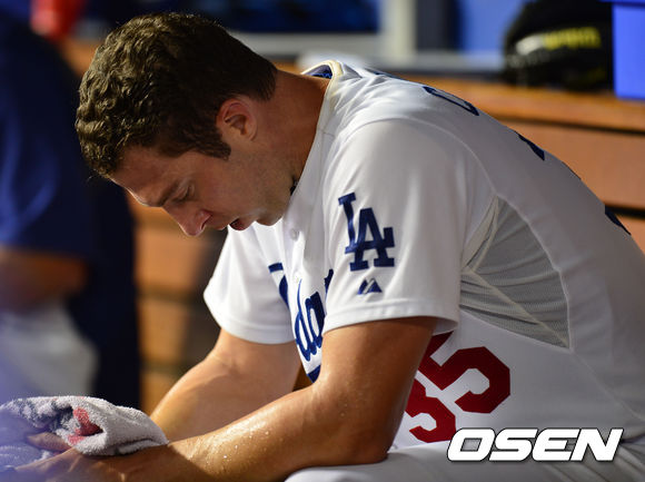 1일 (이하 한국시간) 미국 캘리포니아주 로스앤젤레스 다저스타디움에서 열린 2013 메이저리그 LA 다저스와 샌디에이고 파드리스 경기, 7회를 마치고 교체된 다저스 선발 카푸아노가 덕아웃에서 아쉬움을 삼키고 있다.