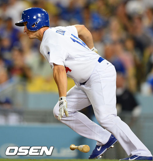 1일 (이하 한국시간) 미국 캘리포니아주 로스앤젤레스 다저스타디움에서 열린 2013 메이저리그 LA 다저스와 샌디에이고 파드리스 경기, 8회말 1사 주자 3루 다저스의 마크 엘리스가 역전 1타점 적시타를 날리고 있다.