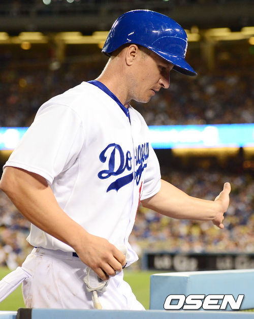 8회말 1사 주자 3루 다저스의 마크 엘리스가 역전 1타점 적시타를 날린 후 도루 실패로 덕아웃으로 들어오며 하이파이브를 하고 있다./ rumi@osen.co.kr
