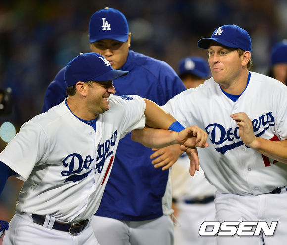 경기를 마치고 닉 푼토와 A.J 엘리스, 류현진이 기쁨을 나누고 있다./ rumi@osen.co.kr
