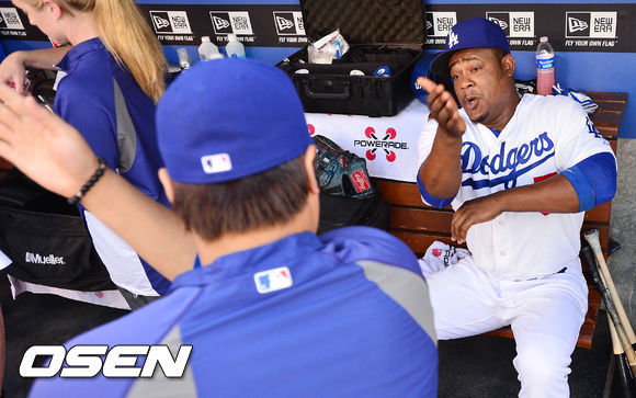 덕아웃에서 류현진이 유리베와 하이파이브를 하고 있다. / rumi@osen.co.kr