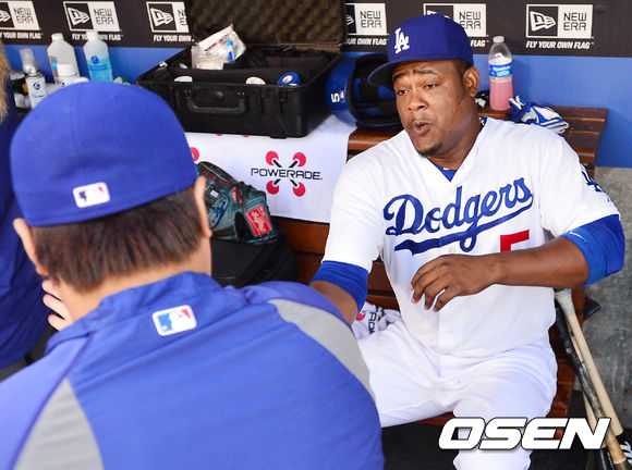덕아웃에서 류현진이 유리베와 하이파이브를 하고 있다. / rumi@osen.co.kr