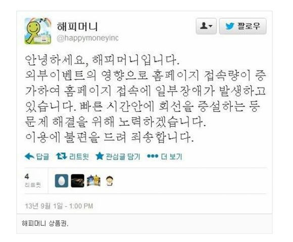 해피머니 측은 1일 공식 트위터를 통해 '안녕하세요. 해피머니입니다. 외부이벤트의 영향으로 홈페이지 접속량이 증가하여 홈페이지 접속에 일부 장애가 발생하고 있습니다. 빠른 시간 안에 회선을 증설하는 등 문제 해결을 위해 노력하겠습니다. 이용에 불편을 드려 죄송합니다'라고 입장을 발표했다.