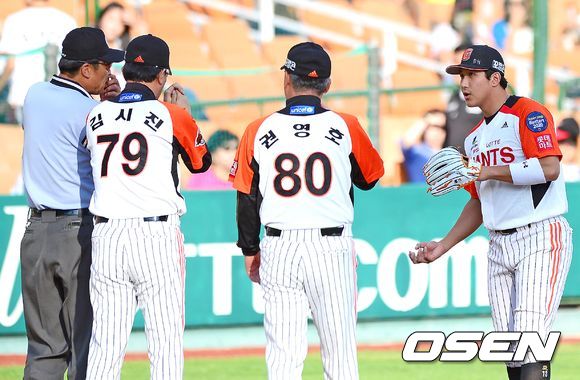 1일 오후 부산 사직야구장에서 열린 롯데 자이언츠와 LG 트윈스의 경기, 1회초 무사에서 롯데 황재균이 LG 박용택의 파울 플라이 타구를 캐치하고 놓쳤다. 글러브에서 고을 빼는 순간 그라운드에 떨어진것, 이에 박기택 3루심이 파울로 선언했다. 김시진 감독이 그라운드로 나와 포구 동작이 끝난뒤 떨어진 것이라고 어필하고 있다. 결국 박기택 3루심은 판정을 번복, 아웃으로 처리했다.