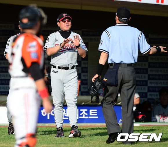 1일 오후 부산 사직야구장에서 열린 롯데 자이언츠와 LG 트윈스의 경기, 1회초 무사에서 롯데 황재균이 LG 박용택의 파울 플라이 타구를 캐치하고 놓쳤다. 글러브에서 고을 빼는 순간 그라운드에 떨어진것, 이에 박기택 3루심이 파울로 선언했다. 김시진 감독이 그라운드로 나와 포구 동작이 끝난뒤 떨어진 것이라고 어필하자 박기택 3루심은 판정을 번복, 그러자 LG 김기태 감독이 최규순 구심에 가볍게 어필하고 있다.
