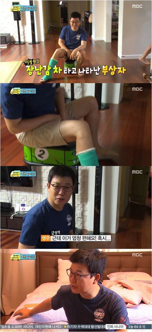김성주는 1일 방송된 MBC 예능프로그램 ‘일밤-아빠 어디가’에서 장난감 차를 탄 채 제작진을 맞았다. 촬영이 없는 사이 운동을 하다가 다리를 다친 김성주는 깁스를 한 채 아이들의 장난감 차를 타고 움직였다.