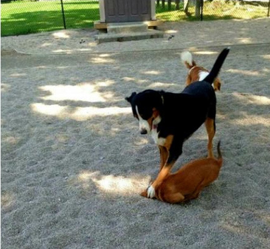 특히 사진 속 큰 검정개의 뒤에서 약자가 당하는 모습을 그냥 지켜보는 또 다른 조그만 강아지의 모습이 이채롭다.