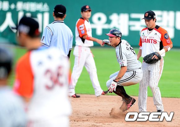 1일 오후 부산 사직야구장에서 열린 롯데 자이언츠와 LG 트윈스의 경기, 3회초 2사 1루에서 LG 오지환이 2루 도루에 성공하고 있다.