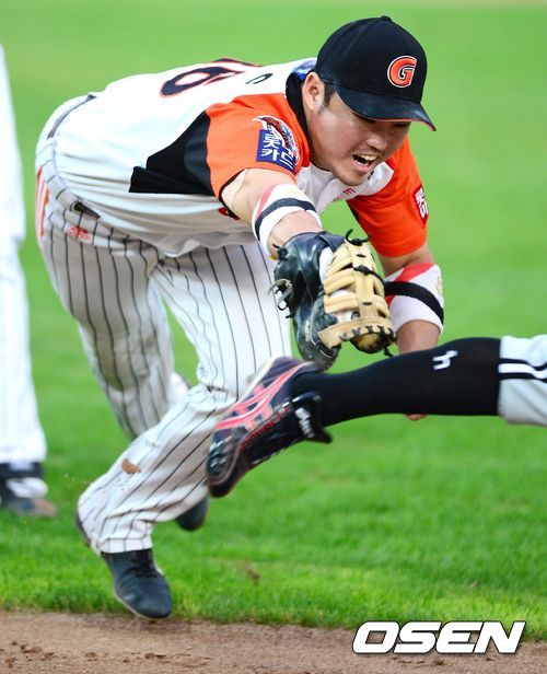 1일 오후 부산 사직야구장에서 열린 롯데 자이언츠와 LG 트윈스의 경기, 5회초 무사에서 롯데 박종윤이 LG 최영진의 1루땅볼 타구에 직접 태그를 시도했지만 아쉽게 실패하고 있다.