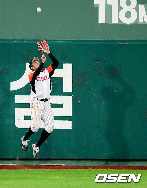 1일 오후 부산 사직야구장에서 열린 롯데 자이언츠와 LG 트윈스의 경기, 6회초 무사 1루에서 롯데 전준우가 LG 이진영의 안타성 타구를 점프해서 잡아내고 있다.