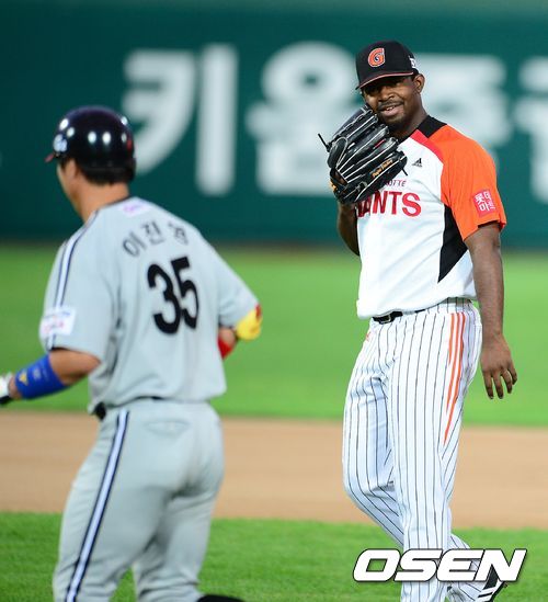 1일 오후 부산 사직야구장에서 열린 롯데 자이언츠와 LG 트윈스의 경기, 6회초 무사에서 롯데 유먼이 LG 이진영의 안타성 타구를 전준우가 점프해 잡아내자 미소짓고 있다.