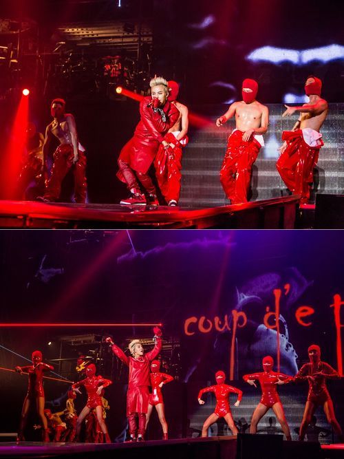 팬들 앞에서 처음으로 선보인 '쿠데타'의 무대는 붉은 복면을 쓴채 상의를 탈의한 남자 댄서들과, 이후 추가적으로 합류한 붉은 파워슈트를 입은 여성 댄스들이 한데 어우러져 꽉 찬 무대를 연출했다. 지드래곤은 완급을 조절하는 랩핑과 함께 리듬을 타는 몸짓으로 '쿠데타'를 완성했다.