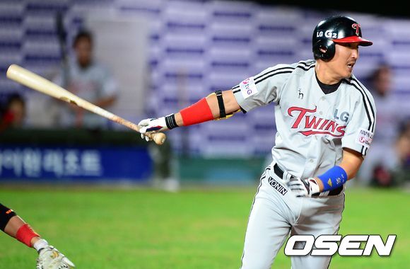 1일 오후 부산 사직야구장에서 열린 롯데 자이언츠와 LG 트윈스의 경기, 8회초 1사 1루에서 LG 이진영이 우전안타를 날리며 찬스를 이어가고 있다.