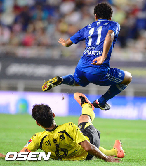 1일 오후 경기 수원월드컵경기장에서 열린 '현대오일뱅크 K리그 클래식 2013' 수원 삼성과 전남 드래곤즈의 경기, 전반 수원 산토스가 전남 이승희의 태클을 피하고 있다