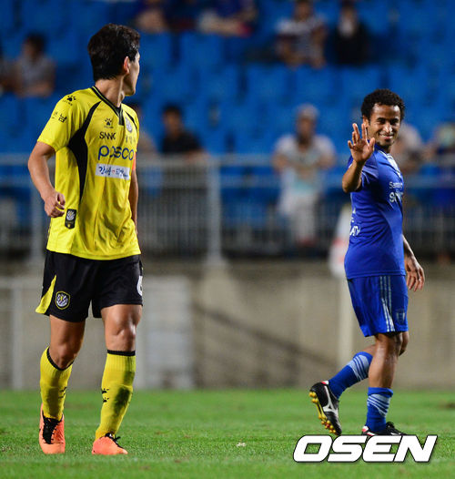 경기종료 후 수원 산토스가 전남 이승희를 향해 인사를 하고 있다. 산토스와 이승희는 작년 제주에서 함께 한솥밥을 먹었다. / soul1014@osen.co.kr