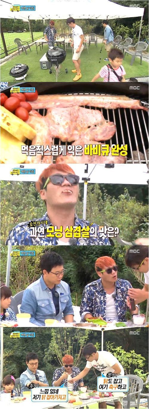 김성주와 윤민수는 1일 방송된 MBC 예능프로그램 ‘일밤-아빠 어디가’에서 아침밥을 얻어먹기 위해 송종국의 전원주택을 찾았다. 하지만 나온 것은 송종국이 솜씨를 한 껏 살린 바비큐 요리가 나왔다.