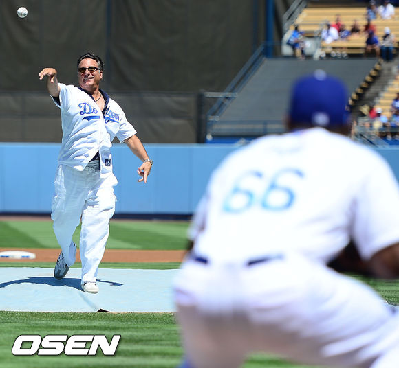 2일 (이하 한국시간) 미국 캘리포니아주 로스앤젤레스 다저스타디움에서 열린 2013 메이저리그 LA 다저스와 샌디에이고 파드리스 경기, 영화 배우 앤디 가르시아와 푸이그에게 시구를 하고 있다.