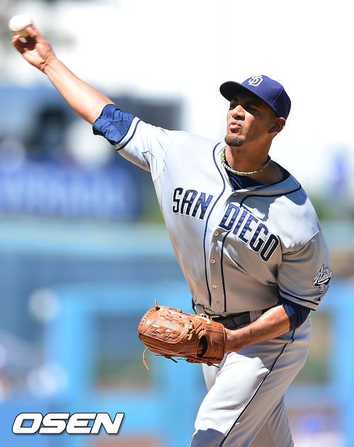 2일 (이하 한국시간) 미국 캘리포니아주 로스앤젤레스 다저스타디움에서 열린 2013 메이저리그 LA 다저스와 샌디에이고 파드리스 경기, 샌디에이고 선발 타이슨 로스가 힘차게 공을 뿌리고 있다.