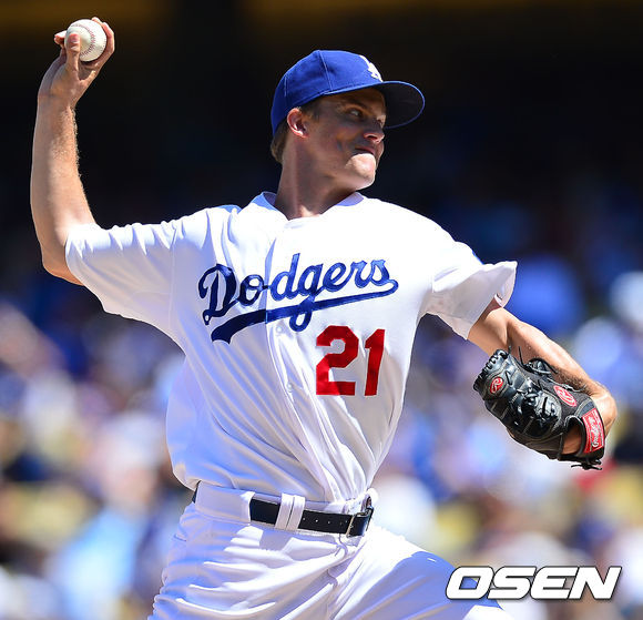 2일 (이하 한국시간) 미국 캘리포니아주 로스앤젤레스 다저스타디움에서 열린 2013 메이저리그 LA 다저스와 샌디에이고 파드리스 경기, 다저스 선발 잭 그레인키가 힘차게 공을 뿌리고 있다.