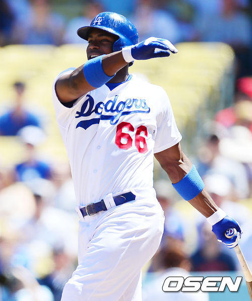 2일 (이하 한국시간) 미국 캘리포니아주 로스앤젤레스 다저스타디움에서 열린 2013 메이저리그 LA 다저스와 샌디에이고 파드리스 경기, 6회말 1사 주자 없는 상황에서 다저스 푸이그가 좌월 역전 솔로 홈런을 날리고 있다.