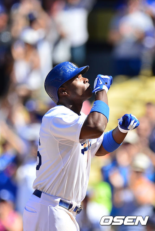 2일 (이하 한국시간) 미국 캘리포니아주 로스앤젤레스 다저스타디움에서 열린 2013 메이저리그 LA 다저스와 샌디에이고 파드리스 경기, 6회말 1사 주자 없는 상황에서 다저스 푸이그가 좌월 역전 솔로 홈런을 날린 후 홈에서 키스 세레모니를 하고 있다.