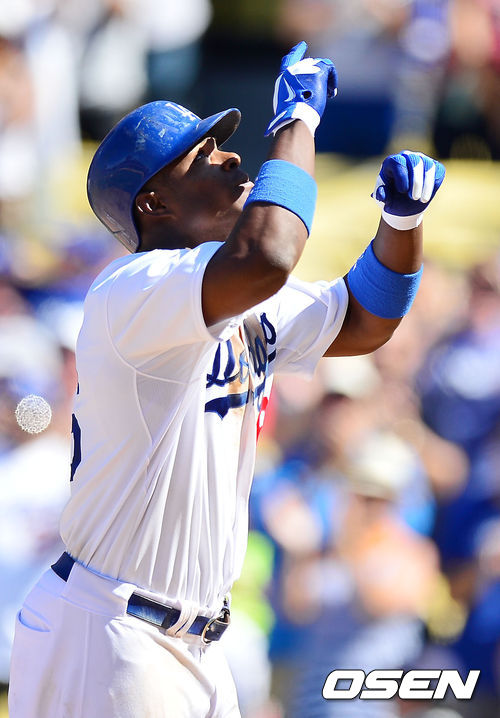 2일 (이하 한국시간) 미국 캘리포니아주 로스앤젤레스 다저스타디움에서 열린 2013 메이저리그 LA 다저스와 샌디에이고 파드리스 경기, 6회말 1사 주자 없는 상황에서 다저스 푸이그가 좌월 역전 솔로 홈런을 날린 후 그라운드를 돌고 있다.