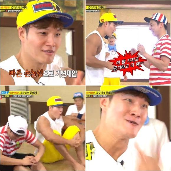 그러나 김종국의 활약이 가장 돋보인 곳은 무엇보다 식당에서 진행된 손바닥 치기 게임에서였다. 양손바닥을 위아래로 번갈아 재빨리 움직여 상대의 손바닥 치기를 피하는 게 관건인 이 게임에서 그는 신화 앤디를 상대로 그야말로 혼신의 손털기를 펼쳐 폭소를 안겼다. 순간을 노리는 공격자 앤디의 손놀림을 피해 빛의 속도로 손바닥 움직이기를 택한 그는 흡사 수준급 요리사가 채를 써는 듯한 포즈를 연출하며 승부욕에 발동을 걸었다. 하지만 빠른 속도를 내느라 금방 힘이 바닥났고 급기야 앤디를 향해 짜증을 폭발시키며 포효해 ‘런닝맨’을 웃음바다로 만들었다.