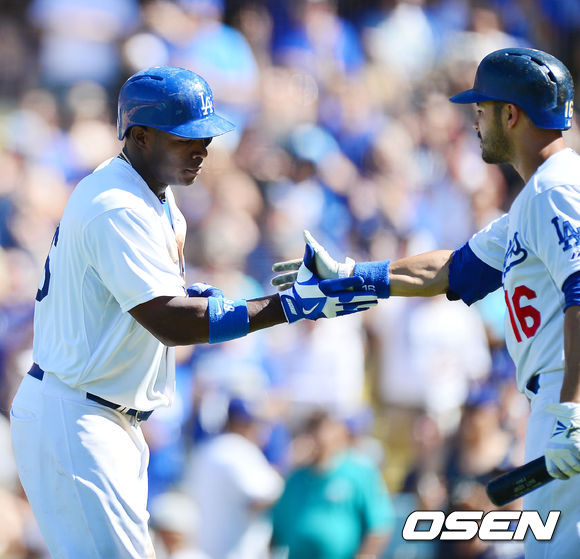 2일 (이하 한국시간) 미국 캘리포니아주 로스앤젤레스 다저스타디움에서 열린 2013 메이저리그 LA 다저스와 샌디에이고 파드리스 경기, 6회말 1사 주자 없는 상황에서 다저스 푸이그가 좌월 역전 솔로 홈런을 날린 후 이디어와 하이파이브를 하고 있다.