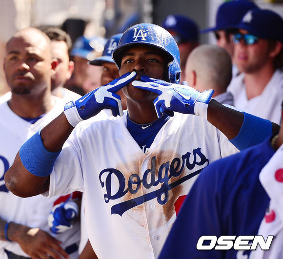 2일 (이하 한국시간) 미국 캘리포니아주 로스앤젤레스 다저스타디움에서 열린 2013 메이저리그 LA 다저스와 샌디에이고 파드리스 경기, 6회말 1사 주자 없는 상황에서 다저스 푸이그가 좌월 역전 솔로 홈런을 날린 후 덕아웃에서 홈런 세레모니를 하고 있다.