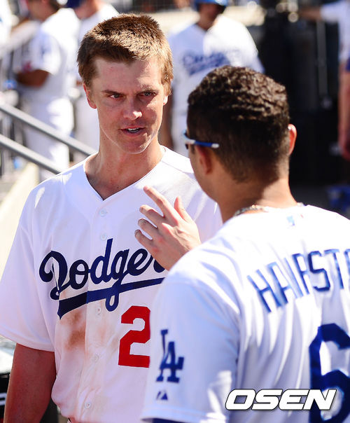2일 (이하 한국시간) 미국 캘리포니아주 로스앤젤레스 다저스타디움에서 열린 2013 메이저리그 LA 다저스와 샌디에이고 파드리스 경기, 7회를 마친 다저스 선발 그레인키가 덕아웃에서 헤어스톤과 얘기를 나누고 있다.