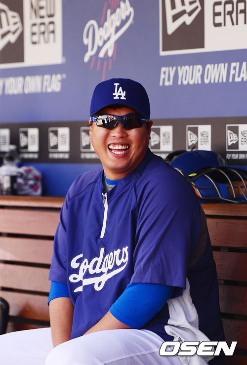 2일 (이하 한국시간) 미국 캘리포니아주 로스앤젤레스 다저스타디움에서 열린 2013 메이저리그 LA 다저스와 샌디에이고 파드리스 경기, 덕아웃으로 나온 류현진이 환하게 웃고 있다.