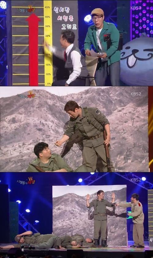 한편 이날 '시청률의 제왕'에서는 전쟁드라마를 소재로 절대로 죽지 않는 주인공, 남자주인공만 챙기는 여자 주인공 등을 꼬집어 웃음을 선사했다.