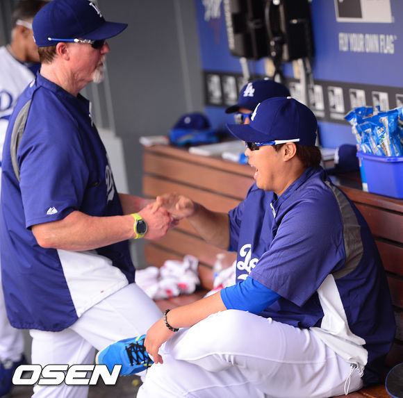 덕아웃에서 다저스 류현진이 마크 맥과이어 코치와 장난을 치고 있다. / rumi@osen.co.kr