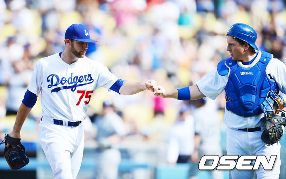 8회초를 마무리한 다저스 로드리게스가 A.J 엘리스와 하이파이브를 하고 있다. / rumi@osen.co.kr