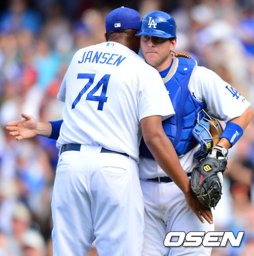 경기를 마치고 잰슨과 A.J 엘리스가 포옹을 나누고 있다. / rumi@osen.co.kr
