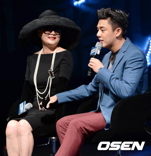 배우 유아인이 김해숙의 손을 잡고 이야기를 하고 있다.