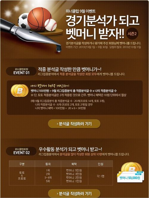 위너클럽 ‘리그집중분석’ 코너에서 토토, 프로토 적중 및 분석글 작성 이벤트